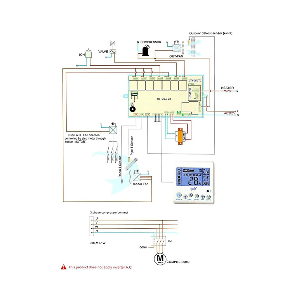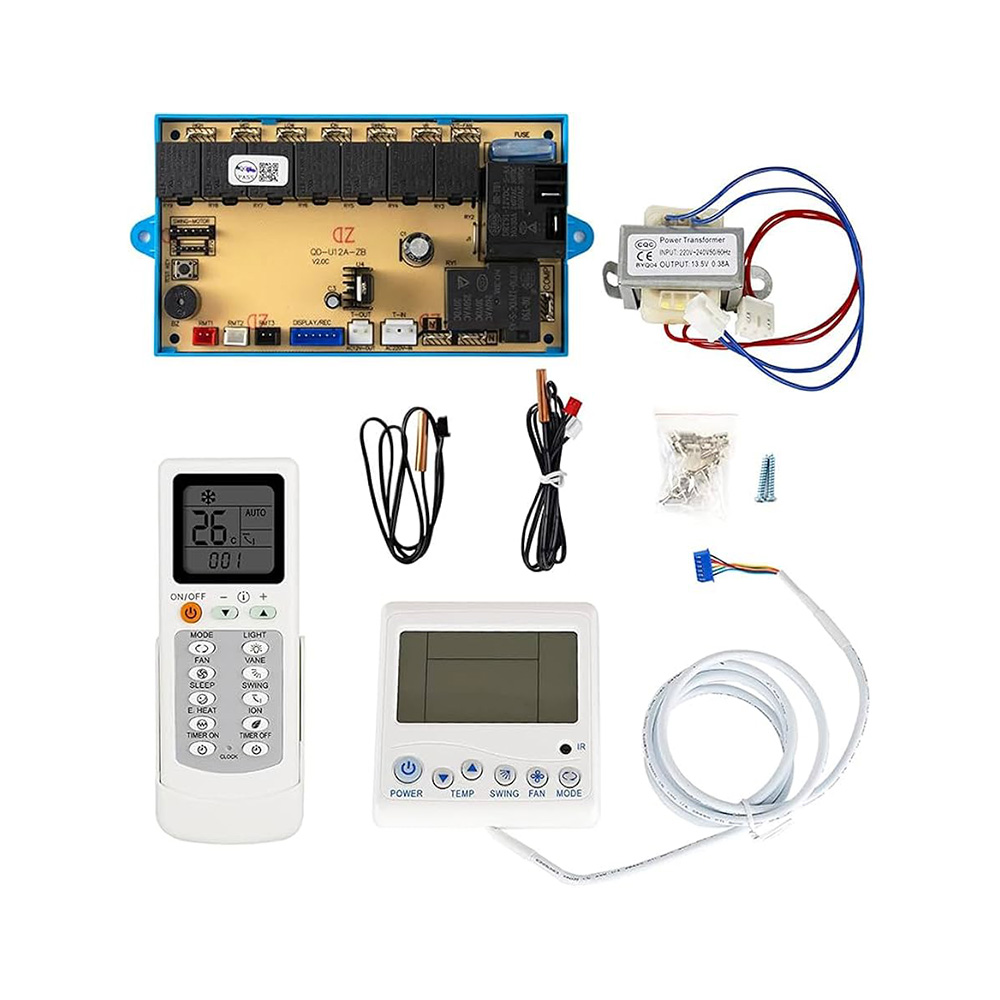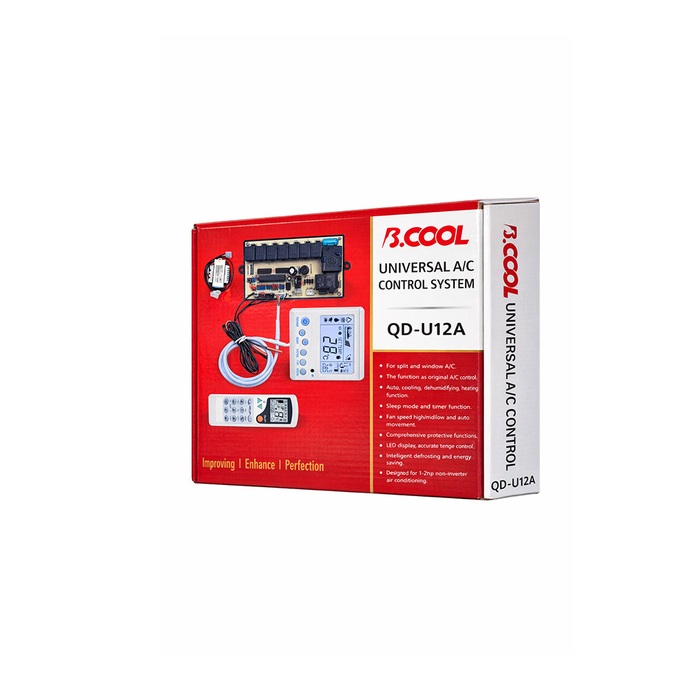QD-U12A Universal A/C Control System یک کیت کنترل یونیورسال برای کولرهای گازی غیراینورتر (ON/OFF) است که زمانی استفاده میشود که برد اصلی دستگاه آسیب دیده، در بازار کمیاب است یا هزینه تعمیر/تعویض آن مقرونبهصرفه نیست. این کیت با فراهمکردن برد کنترل اصلی + پنل دیواری LCD + ریموت IR + سنسورهای دما + ترانس تغذیه، کولر را دوباره راهاندازی کرده و عملکردهای رایج مثل سرمایش/گرمایش، کنترل فن، تایمر و دیفراست را مدیریت میکند.