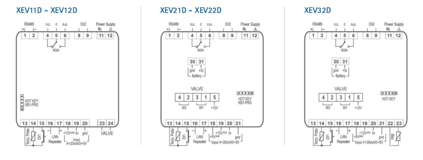 یکی از مهمترین بخشها (برای بازار تبرید حرفهای)، خانواده کنترلرهای سوپرهیت (Superheat) است؛ یعنی کنترل دقیق شیر انبساط الکترونیکی (Stepper EEV) بر پایه سنسور فشار و سنسور دما. برای سری XV جدول ویژگیها آمده که مدلهای XV01D / XV02D / XV03D را کنار هم مقایسه میکند.